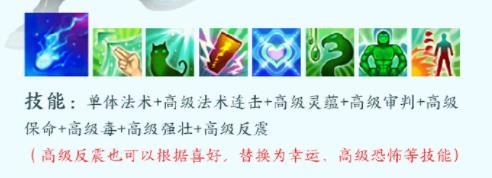技能:单体法术 高级法术连击 高级灵蕴 高级审判 高级保命 高级毒 高级强壮 高级反震