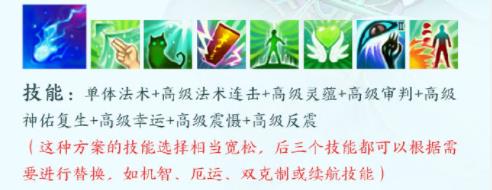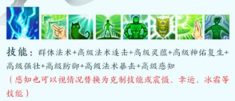 技能:群体法术 高级法术连击 高级灵蕴 高级神佑复生 高级强壮 高级防御 高级法术暴击 高级感知