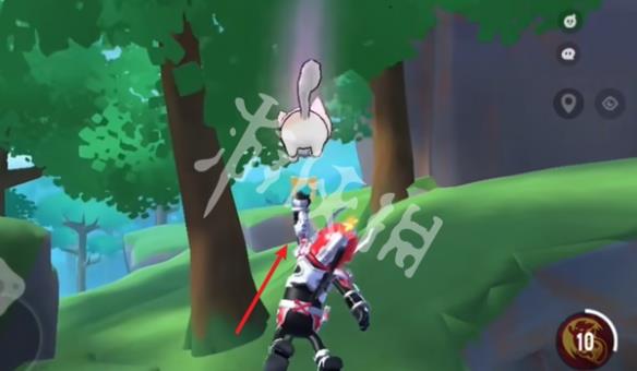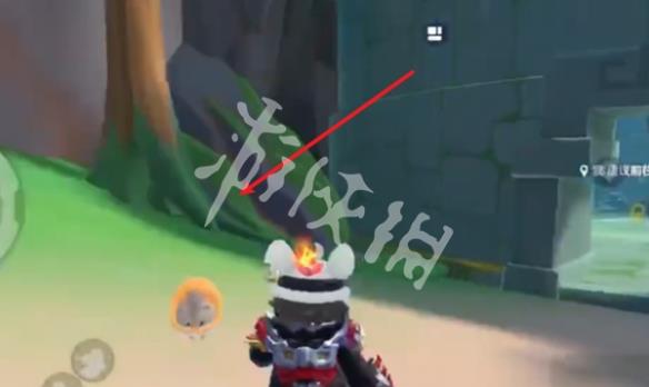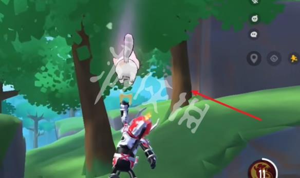 3、点位三:在图中的位置,利用小跳往上,上来后,侧身猫猫跳再用飞高高,去箭头处的角落利用猫猫跳上去,上来后上箭头处的大树即可。