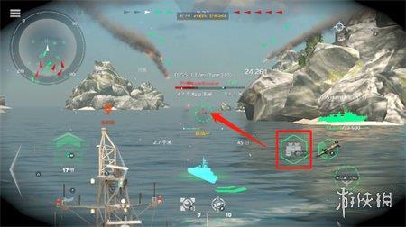 5、发现敌方战舰后,我们可以通过滑动屏幕来改变武器的瞄准方向,点击下图所示位置,即可快速使用武器开火射击。