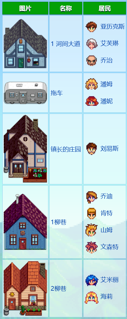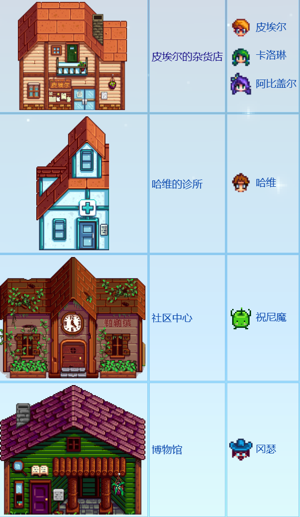 村中:这里有18个人物,分别是刘易斯(村长),马尼(护士),哈维(医生),皮埃尔(种子店老板),卡罗琳(皮埃尔的妻子),艾比盖尔(皮埃尔的女儿),乔治(轮椅老头),埃芙琳(乔治的妻子),阿莱克斯(乔治的孙子),贾斯(小男孩),文森特(小男孩),潘妮(贾斯和文森特的母亲),萨姆(音乐家),肯特(萨姆的父亲,退伍军人),乔迪(萨姆的母亲),海利(时尚女孩),艾米莉(海利的姐姐,裁缝),克劳斯(酒吧老板)。他们都住在村中的不同建筑里,你可以在这里找到他们的家,医院,种子店,酒吧等。你可以在这里给他们送礼物,接受他们的任务,参加他们的活动,了解他们的故事。