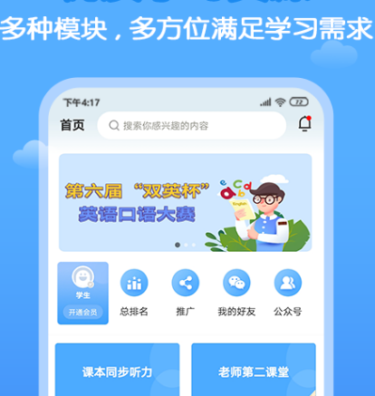 专门为学生所打造的英语学习软件,功能比较齐全,有配音听力、口语学习等各种栏目。紧贴教材课本,在跟读的同时帮助学生巩固基础知识,突破重点难点。