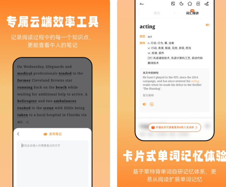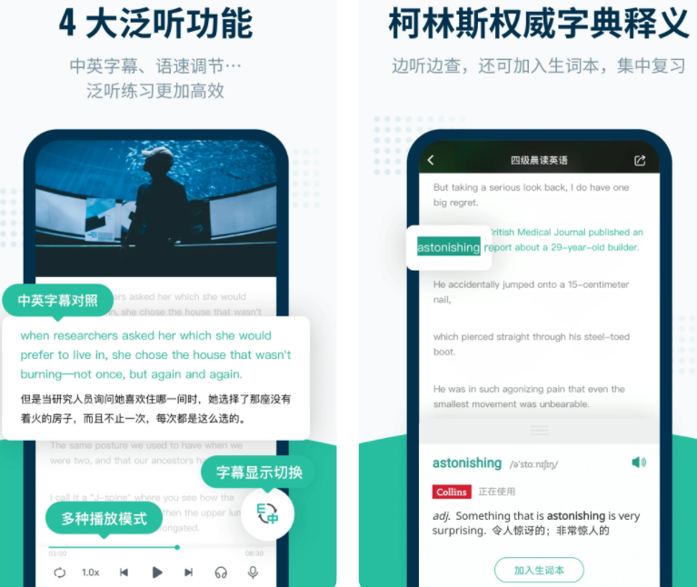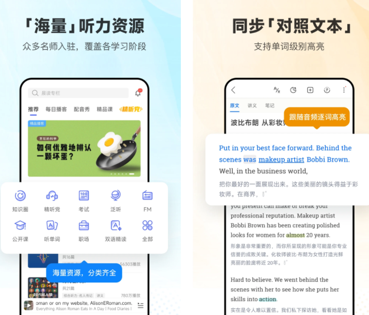 软件内有海量听力资源,众多英语名师入驻,覆盖里不同的英语学习阶段。英语听力有对照的双语文本,一边听一边看字幕,重点单词还会有特别高亮,让你记忆更清晰。
