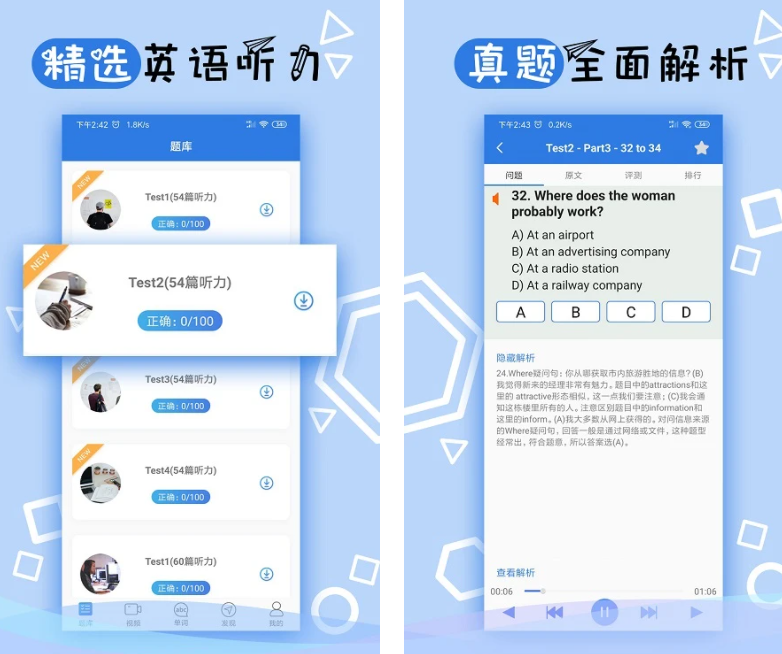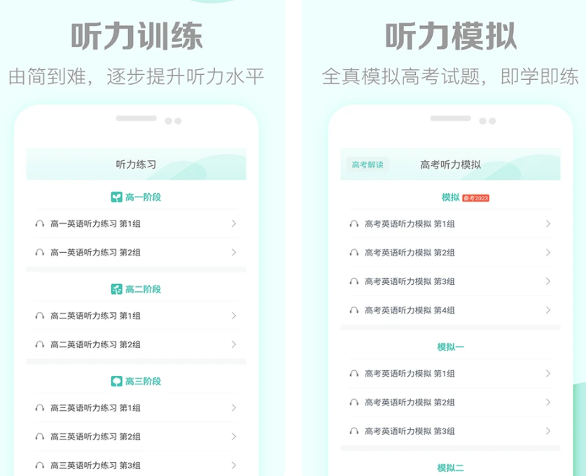 软件有从简到难,逐步提升英语听力水平的训练。收录历届的高考真题,有考场原始的英语录音播音,让你身临其境地练习听力。