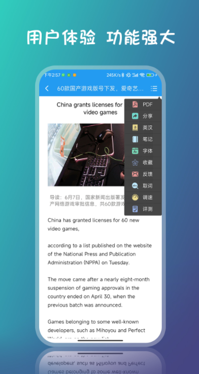 这款软件收入来自海外各大新闻平台的英语原文新闻,每日都有新闻资讯更新,让你轻松了解天下事,还能从原文阅读与点击听力中提升英语水平,同时也有英语小视频新闻可边看边听。