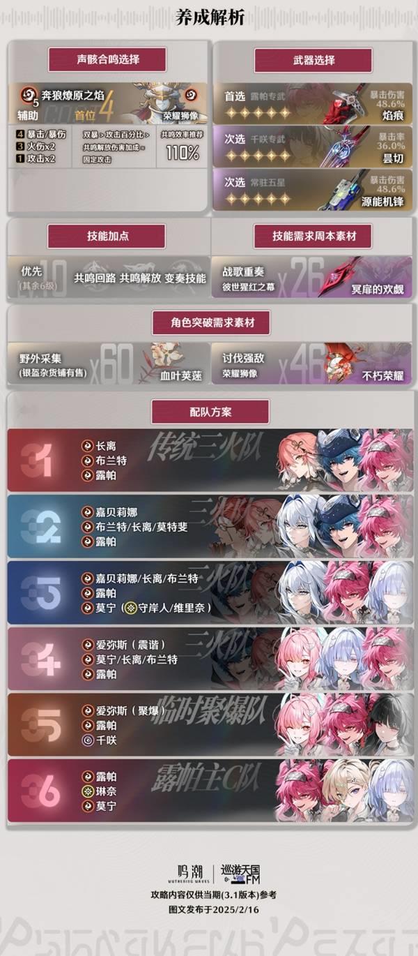 《鸣潮》3.1版本中五星角色露帕迎来复刻,关于她该如何培养和操作的问题,下面为大家简单整理了“巡游天国FM”带来的露帕攻略。培养方面,优先提升武器和天赋等级,核心技能要重点加强,装备选择上推荐高攻击力和适配属性的套装。操作上,露帕的连段需要注意节奏,利用技能衔接普攻打出高爆发伤害,合理运用闪避和大招提升输出效率。至于队伍搭配,建议选择能够补充续航或提供增益的角色与其配合,从而最大化团队战斗力。