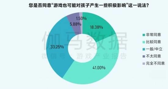 家长对孩子游戏的具体态度与家长对游戏的整体认知显著相关。调研结果显示,59.38%的受访家长总体上认同“游戏也可能对孩子产生一些积极影响”这一说法,约三分之一表示中立,而持否定意见(不太同意或完全不同意)的家长比例极低,合计仅占7.38%。
