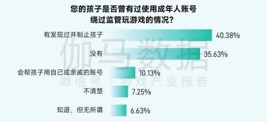 面对“孩子是否使用成人账号绕过监管”这一问题,表示没有或不清楚的受访家长合计超过四成,发现过并制止孩子的家长占比40.38%,10.13%家长会帮孩子用自己或亲戚的账号绕过监管。