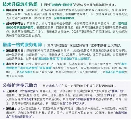 腾讯游戏自2017年起率先构建覆盖未成年人游戏行为“事前-事中-事后”各环节的保护体系,并在2025年2月全面升级探索“技术 服务 公益”未成年保护新模式,以技术为基石筑牢防沉迷底线,以服务为桥梁协同家庭共治,以公益为引擎驱动长远发展,全面护航青少年健康成长。在技术方面,持续提升精准管控和动态干预能力,针对“代过人脸”等痛难点强化打击力度;在服务方面,进一步搭建家庭服务矩阵,帮助家长提升监护能力和水平;在公益方面,通过扩容公益行动链接更多游戏产品、玩家、社会力量。八年来,腾讯游戏通过责任领先、技术领先、服务领先、理念领先的战略布局,逐步形成“防沉迷 助发展”的双轮驱动,持续完善未成年人保护生态系统,已经取得了数据验证的实效成果。2024年,腾讯本土游戏业务中未成年人游戏时长占比为 0.2%,创有记录以来年度新低。此次模式升级,从不同层面着力解决未成年人防沉迷的核心挑战,构建起相互支撑、协同作用的整体架构,不仅是腾讯游戏对自身保护体系的进一步深化,也体现了对行业防沉迷工作建设的前瞻思考。未来,腾讯游戏将继续深化未保体系迭代,推动未保工作从“合规达标”向“价值共创”升级。