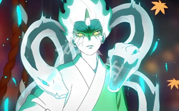 巳月爆发仙人模式查克拉,召唤多道蛇雷咬住敌人,将毁灭性的蛇雷能量持续轰炸;奥义后半段不可替