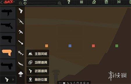 3、进入地图创建界面,点击左下方最后一个图标可以切换主题、场景、武器和角色选项,长按地图上的物品可以拖动物品的位置进行调整。