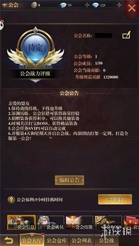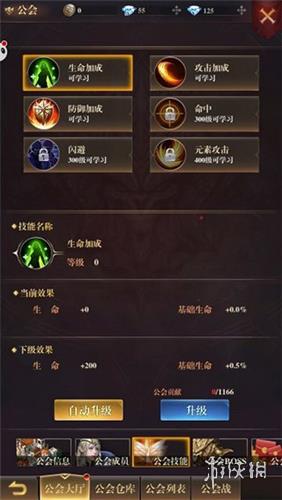 公会仓库方便成员互通有无、更换装备;公会技能可提升角色属性(攻击、防御、生命、命中、闪避、元素攻击);挑战公会BOSS(每天20:00-22:00开启)可获得装备、金币、公会贡献等奖励。