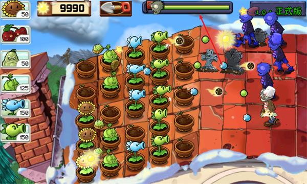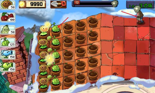 ①经济作物向日葵,水上必须放莲蓬,水路最后4格不会突然冒出僵尸,如果水上有钢帽子僵尸,此时你水路火力还薄弱,可以用墙国挡,也可以用25YG的海藻消灭。