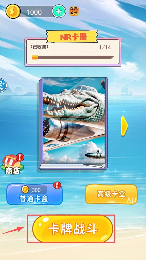 拍卡王者怎么玩1、进入软件后,先看主界面。上方有1000金币,中间是NR卡册,显示收集了1/14张。左下角有商店,右下角是高级卡盒。