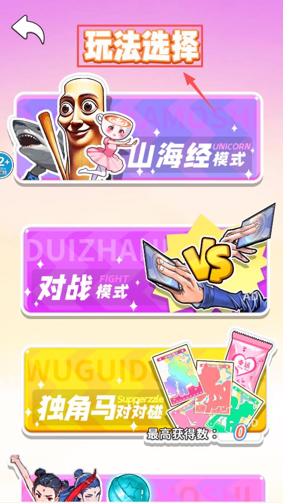 2、在主界面点击“卡牌战斗”,就能进入玩法选择。这里有山海经模式、对战模式,还有独角兽对对碰模式呢,你可以根据自己的喜好来选。