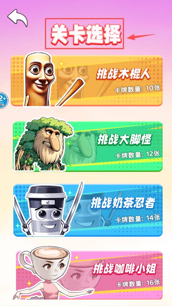 3、选择模式后,比如进对战模式,就会到关卡选择。能看到挑战木棍人、大脚怪等不同关卡,每个关卡需要的卡牌数量都不一样。