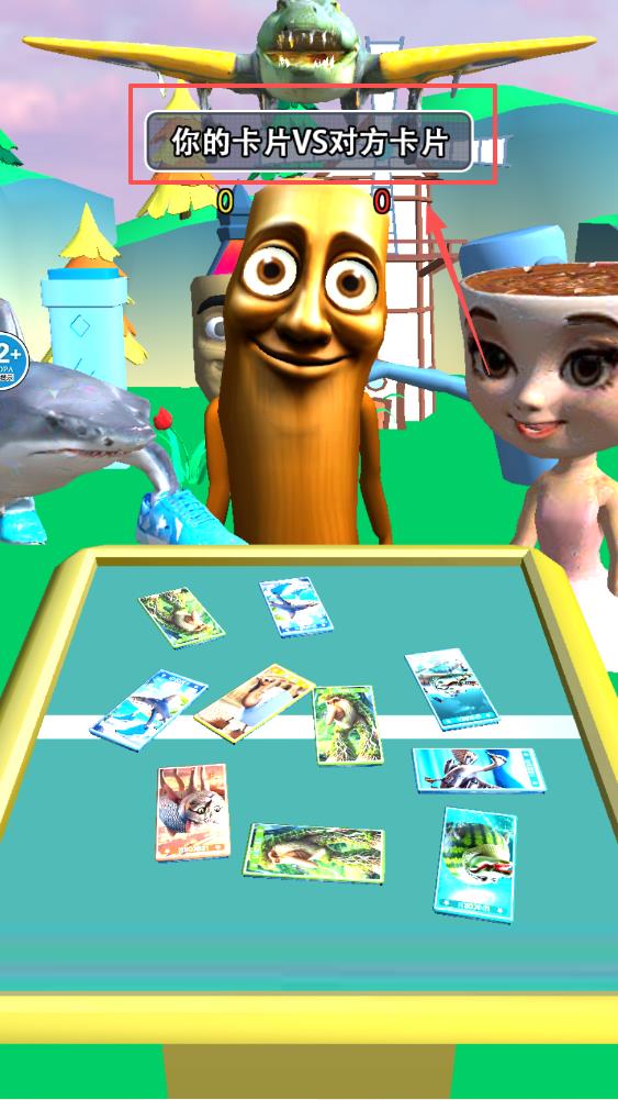 4、选好关卡就正式开战了。界面会显示“你的卡片VS对方卡片”,把卡牌放到桌上进行对战,背景很卡通有趣,目标是赢得比对方更高的分数。