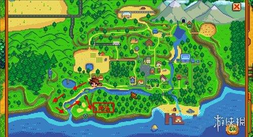 5、从自家农场出发,往南走(走下方的路),然后稍微往右走,会看到两座小木桥,走过去。
