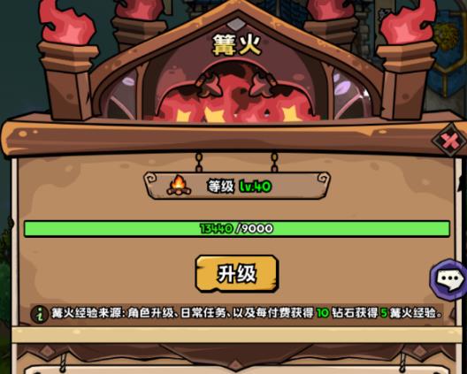英雄冒险团篝火获取方法1、角色升级、日常任务、以及每付费获得10 钻石获得5 篝火经验。
