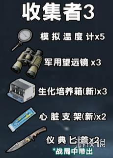 上交5个非绑定的模拟温度计,3个非绑定的军用望远镜,3个非绑定的生化培养箱,2个非绑定的心脏支架。