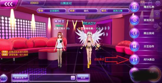 表白:首先需要持有“表白卡”,可在商城购买,购买后在游戏房间内,点击玩家,在右侧菜单中选择“向他表白”。