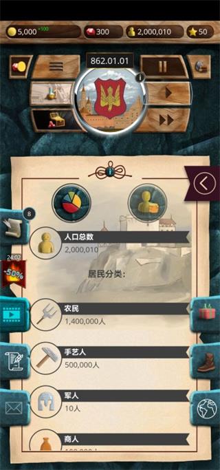 6、人口,你可以看到自己当前各个单位的人口数量,也可以招聘农民或其他经济单位,一来不要随意招聘太多,不然会粮食短缺,你的国民支持度(后面讲)会下降
