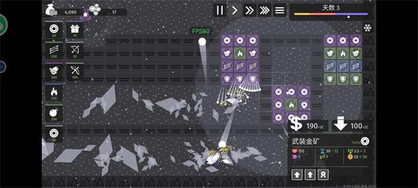 开局直接在中间使劲摆【武装矿井】就行,来的几个菱形完全可以无压力的应对!左边阵地的后三格也可以放武装矿井,然后直接安心发育就行了!升!升塔的钱矿井出!前期直接把【日光塔】和【武装矿井】拉的满级没有压力!如果缺水晶在右边阵地后三格放【能产水晶的那个矿井】。剩下直接在左边放多重和大炮,因为多重的射程近所以放在前面,大炮放在后面,热能塔两边各一个。优先放左边因为可以连带着打下路,然后直接库库升级!多重分支右侧阵地选【广角射击】,左边阵地选【穿透散弹】;大炮选【连续射击】就行;盾不重要!它要真的吵着让你给它升级你就给他升【瞬时防御】!第三天来的刹那把热能塔给我抬到二级!我敢说右边阵地都干不了啥事,因为大炮、多重可以帮助打到下面,而八个武装矿井相当于八个绿箭塔!