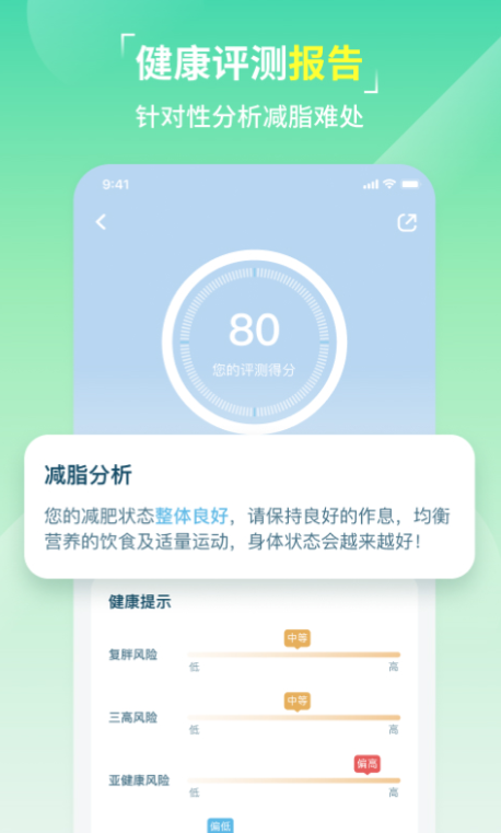 一款能帮助大家全方位减肥的运动健身软件,软件从吃和运动两个角度为大家量身定制合理的减肥计划,专业的营养师会给用户提供非常健康的饮食菜单,并且软件还会给大家分析三高、复胖风险,让大家运动的更有积极性。