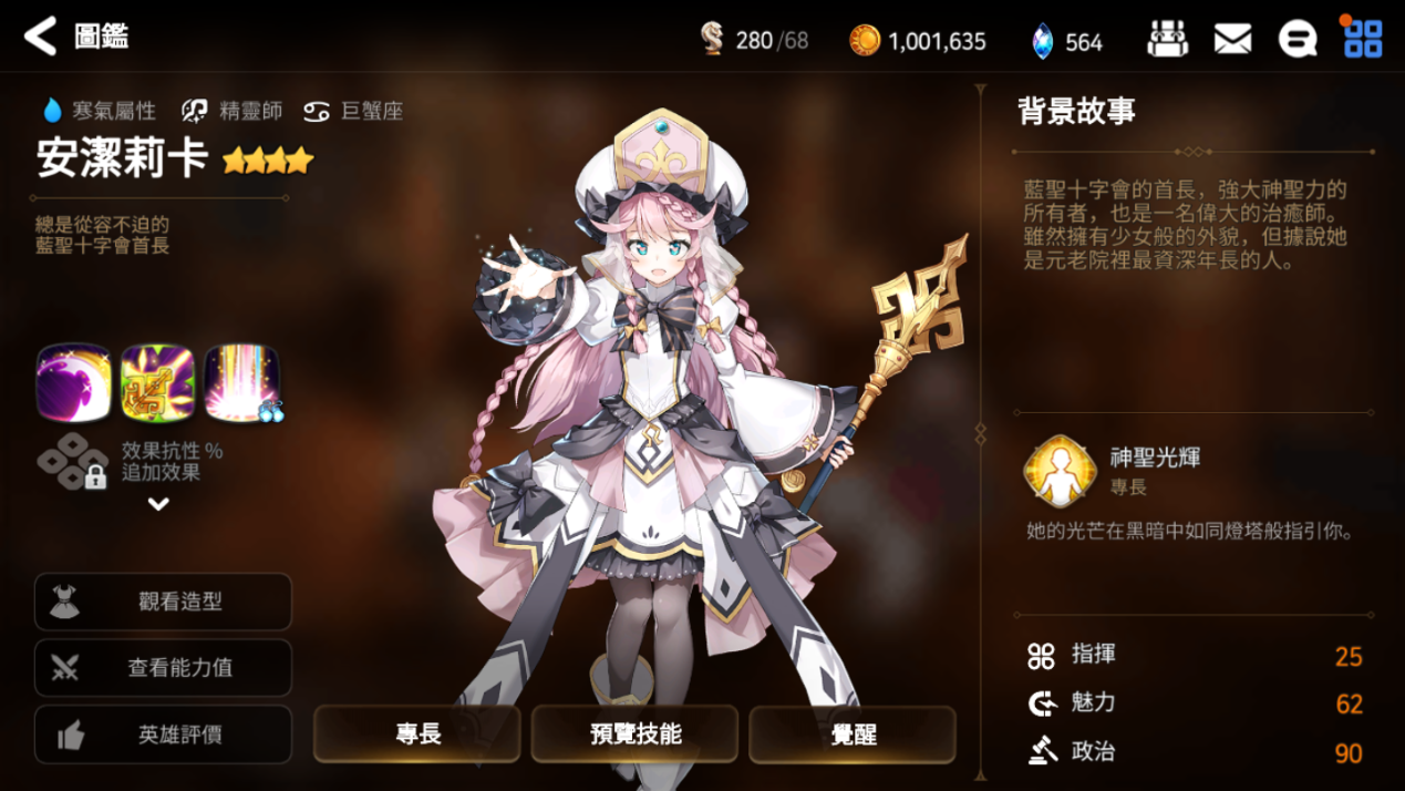 该人物主要在队伍中作为奶妈角色,对于玩家前期来说,这个角色的掉落几率较大,很容易获取升星要求也不苛刻,并且奶量可观,即使玩家参加龙战也能对游戏队伍有很好的帮助。