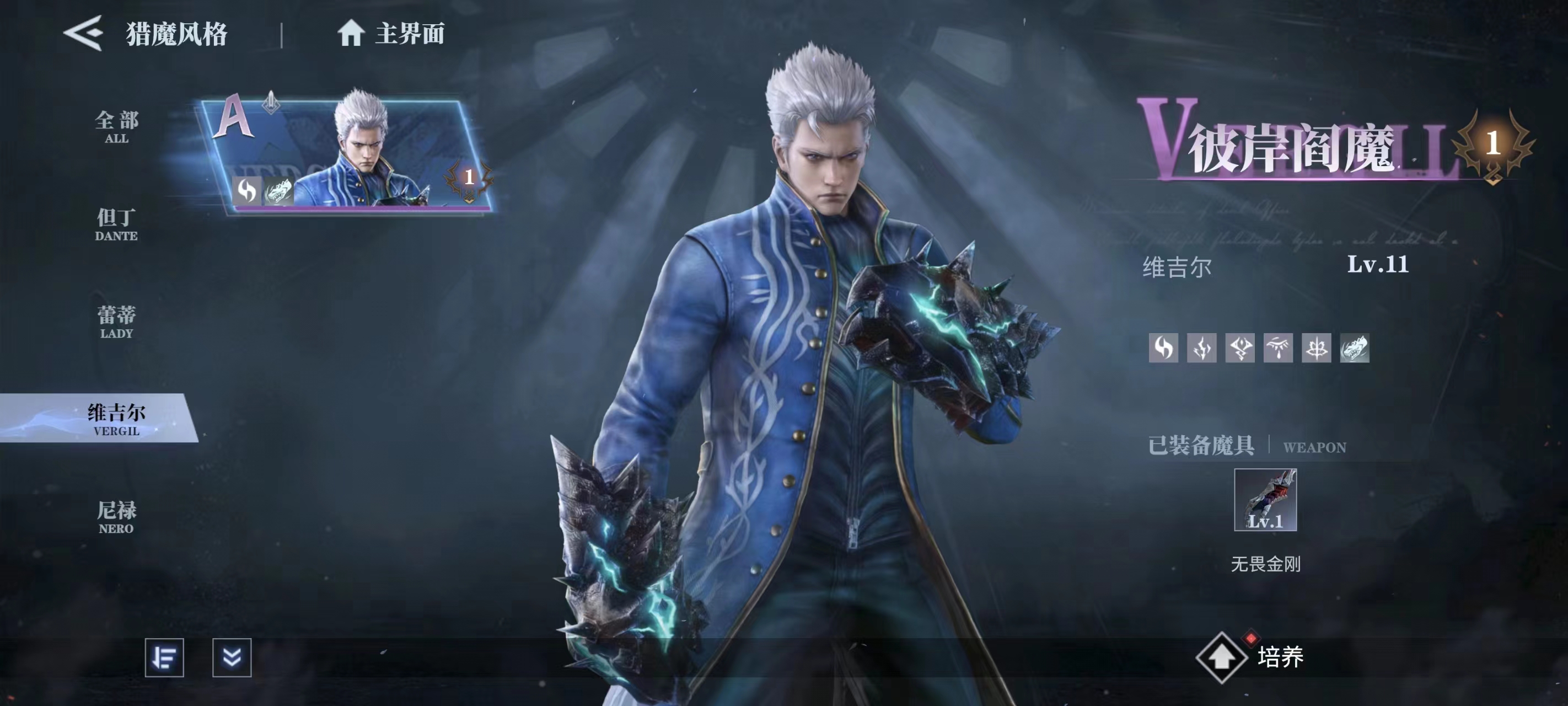 大家也不用因为暂时看不到他的魔人形态而沮丧,毕竟游戏才刚刚上线没多久,既然但丁都有魔人形态,人气更高的维吉尔后续肯定也是会有这一形态的,因此各位可以先把维吉尔的等级和技能都培养上去,到后面更新魔人的变身技能时就可以直接体验了。