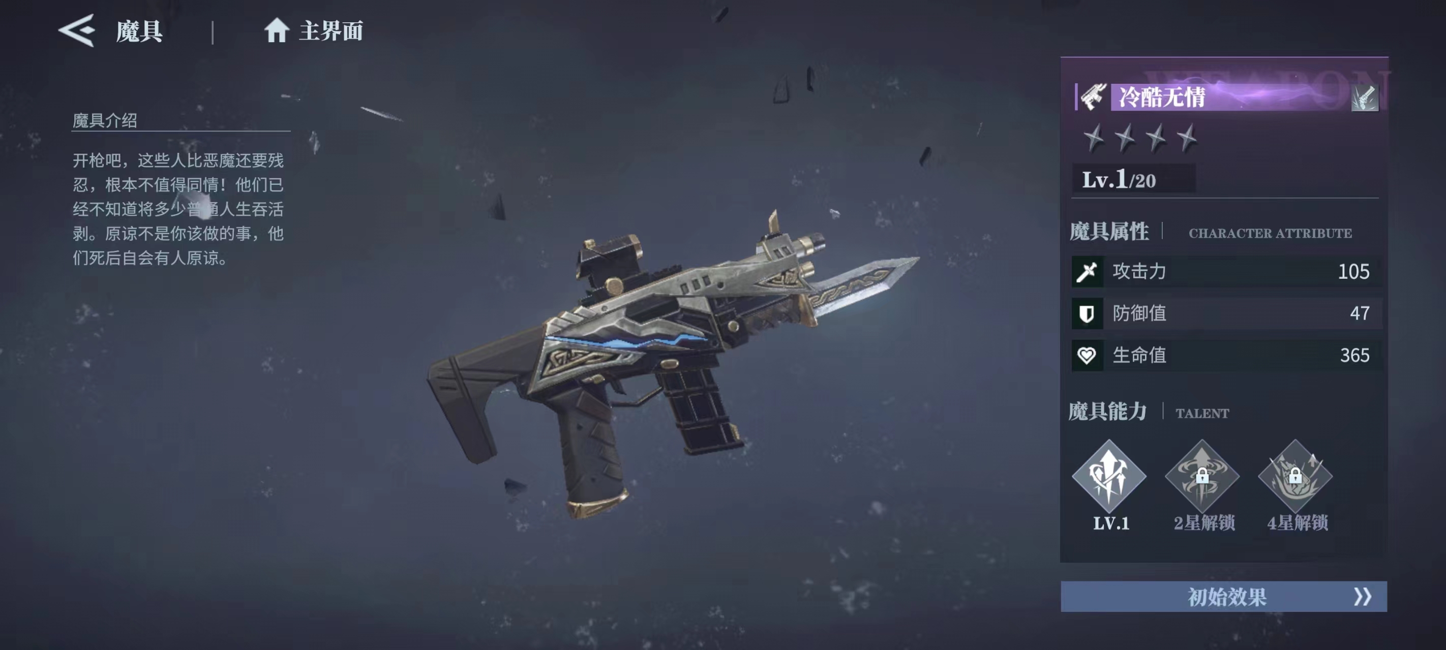 冷酷无情:紫色品质的武器,蕾蒂前中期如果抽不到橙武,那么带上它绝对是一个最佳的选择,105的攻击和47的防御足够在前半部分的主线剧情中横行霸道,并且在魔具能力上,它分别提供了7%的全伤害和2%的攻击力加成,在四星时还会解锁一个独特的空中增伤能力,这对于喜欢操作的朋友绝对是一个福音,因为在空中的时候你无论是进行普攻还是施放技能都可以吃到这个增伤,并且它的增伤数值也相当可观,一级就直接达到了6%!