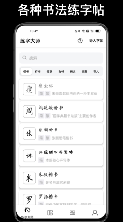 这款练字软件不仅可以生成和打印各种字帖,还支持在平板上进行临摹练习,让用户能够轻松感悟多种不同的书法风格。而且,软件还提供了在线生成多种名家字体的功能,包括行书、楷书、隶书等,让用户可以直接进行练习。不管你喜欢哪种书法风格,这款软件都能满足你的需求,让你的练字过程更加多样化和有趣。快来下载体验,探索不同书法的魅力吧!