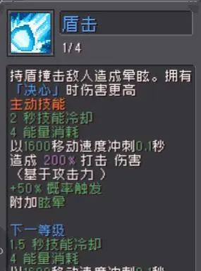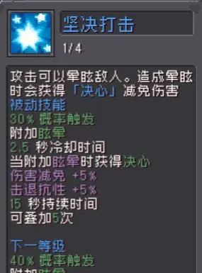 其技能坚决打击可以对敌人造成伤害的同时,还会对敌人造成眩晕,冷却时间也比较短,眩晕后会增加自身的伤害减免和抗击退能力,这个技能可以说是目前设计的最为全面的了,而且还可以叠加5次,这个技能在实战中那肯定是不容小视的,第二个技能撞击也是会造成多次眩晕,控制直接拉满了,而且在有【决心】的时候,技能伤害居然高达200%,这是很多输出职业都比不了的伤害。