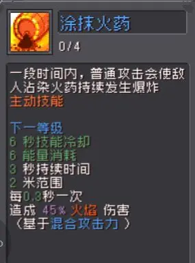 【涂抹火药】:火焰射手在一段时间内,普通攻击会使敌人粘上火药,会对2米内的敌人每0.3秒一次造成45%的【火焰】伤害,持续3秒的时间。但是这个伤害玩家们需要注意的是,会跟着装备的加成和角色属性光环的加成而提升,其技能升级后,伤害也会更加的高。需要6秒的冷却时间并且消耗6点能量。