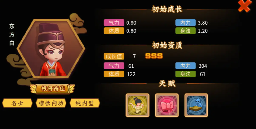 东方白这个角色是小编非常强烈推荐玩家作为主要的输出来进行使用的,在角色的设定天赋技能上都能相互补贴转化出很好的输出效果能加一定的buff,在速度、暴击、伤害、内力上都有大幅度的提升。技能搭配好之后能达到天花板级别的输出效果,当然也有一点相应的短板。本身输出力量低之后所带来的效果就是脆皮,防御力比较薄弱,且所有技能都没有自保技能就需要队友的辅助支援。