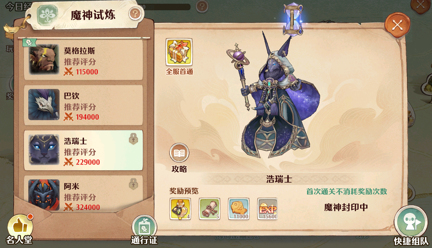 最后就是队伍中这些人的练度都需要达到一定要求,至少得保证你的战力在十八万往上,前期能提升战力的方法不多,进来之前把装备品质,等级给拉满,然后猫灵也带上自己最好的即可。