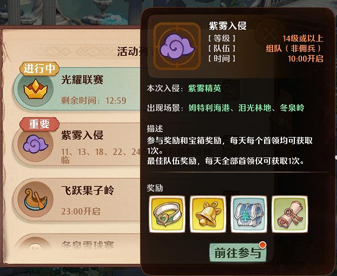 2、选择限时活动,选择【紫雾入侵】副本,选择参与前往。