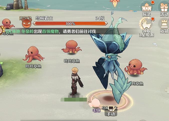 组队到达目的地后,就只能自行寻找紫雾首领BOSS了,刷新点不固定,紫雾首领BOSS出现的固定时间为11、13、18、22、24点,boss的名称也是不固定的,有的叫鲨鱼霸主、有的叫乌贼霸主,反正很大一只的,非常明显。