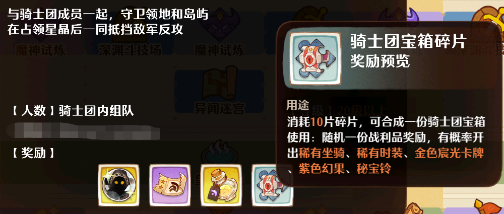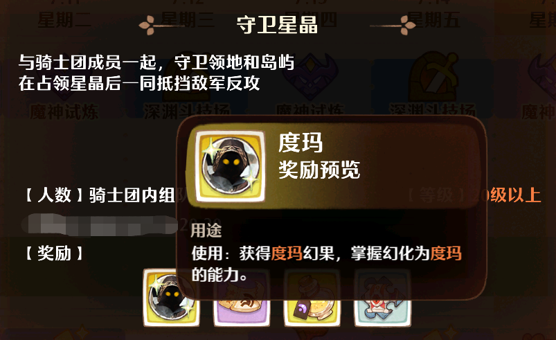 该模式是一个比较艰巨的过程,需要玩家对自己角色,猫灵以及装备的练度都达到一定水准,否则就没法染指那丰厚的奖励了,守卫星晶的奖励包括“度玛”,“资金券”,“混沌之尘”和“骑士团宝箱碎片”这四种,其中度码是最为珍贵的,因为它可以直接给你一颗橙色品质的幻果。