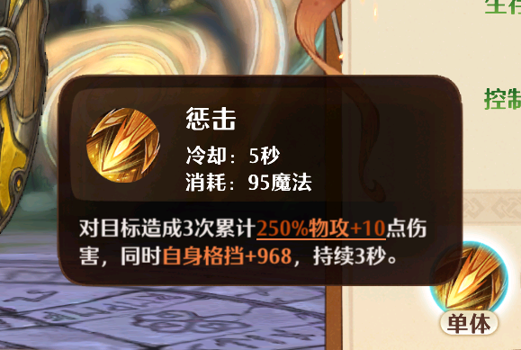 再来看看它的四个技能,一技能“惩击”是一个单体伤害技,使用后会对目标进行三次连击,一共造成250%物攻 10点伤害,同时还会提升自己三秒的格挡。该技能可谓攻防一体,也是骑士作为一个前排职业能立足前线的根本,这一技能单次攻击虽然不高,但三连击之下对脆皮敌人还是可以造成可观伤害的,另外一手格挡数值的加成也让其本就不错的坦度优势变得更加突出,而且值得一提的是该技能的初始CD只有5秒,因此获得格挡增益的实际时长还是很多的。