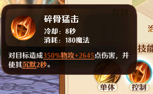 二技能“碎骨猛击”仍然是单体伤害技能,在伤害数值上要远高于惩击,达到了350%物攻 2645的水准,它的基础伤害特别高,所以在前中期的时候能够明显感觉到该技能的强悍爆发,另外此技能命中目标后还会施加两秒的沉默效果,打PVE和PVP都比较适用,能够无伤消耗敌人后全身而退。