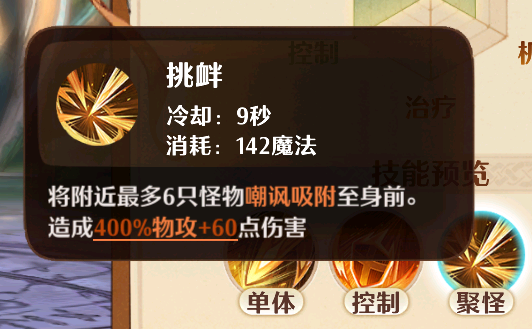 三技能“挑衅”是一个群体拉怪技能,不过它的范围仅限角色周围,使用时骑士会将附近的最多6只怪物给拉过来,之后将造成400%攻击 60的物理伤害,虽然基础伤害不高,但它的加成倍率还是很够看的。并且该技能的功能性也十分突出,组队刷本的时候能够利用这招来迅速将大量小怪拉入主力输出的技能范围内,从而实现迅速的清图。