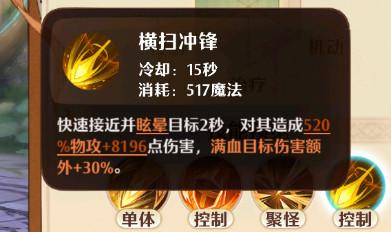最后的大招“横扫冲锋”则是一个十分稳定的硬控,它可以让你直接冲向自己的目标,从而造成520%物攻 8196的伤害并附加两秒眩晕,值得一提的是该技能并不会出现过分的击退效果,所以先手施加眩晕控制之后完全无需担心队友跟不上,另外该技能对于满血目标还会造成额外30%的伤害,因此实战中完全可以先手施放。总结来说,这一技能兼具高额的爆发与稳定的控制,并且十分适合先手使用,是配合队友的神技!