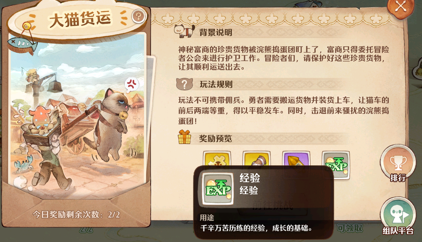 大猫货运:这个玩法每天可以参与两次,它能够稳定提供绿色类型的经验,这个类型的经验会受到每日获取上限的影响,所以一定要先去打完,另外通过该模式你还有机会获得一些诸如万灵卡牌碎片和金色装备之类的珍稀奖励!