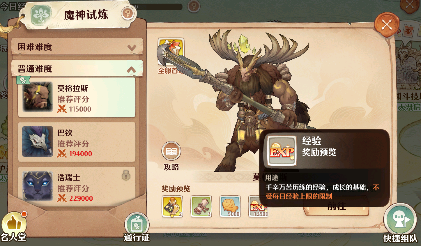 魔神试炼:这个玩法的难度相对来说要更高一些,因为它需要你前去挑战各种boss级别的魔神,这些魔神有普通和困难难度之分,无论哪种难度均可提供海量的红色经验,这种经验不受每日经验上限影响,不过它的获取门槛较高。