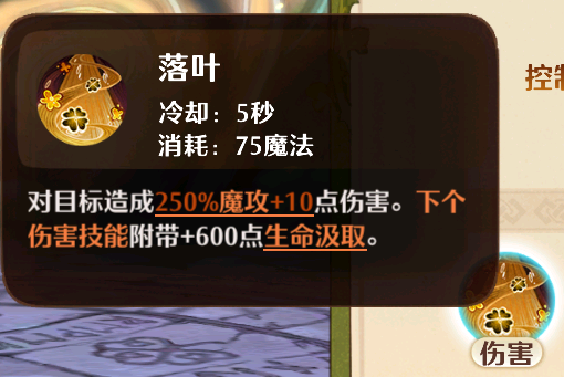 那么下面继续给各位介绍下它的技能,一技能“落叶”是一个冷却仅有五秒,并且魔力消耗也仅需75点的伤害技能,使用后可以对单体敌人造成250%魔攻 10的伤害,并且之后还会让下个伤害技能附带600点生命汲取,这意味着之后使用伤害技即可为自己回复生命值,充分保障了自身的续航,操作得当的话,自身的血量可以始终处于一个较为健康的水准。