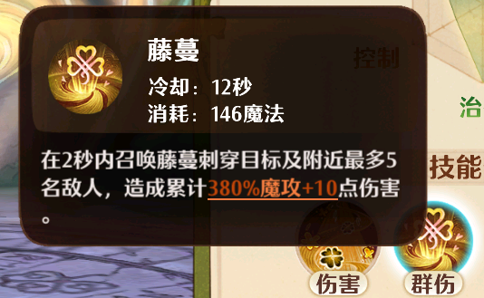 二技能“藤蔓”则是冷却12秒,魔力消耗为146的群伤技能,使用后会在两秒内持续召唤藤蔓来穿刺敌人,不过该技能最多只能同时攻击五名敌人,每个敌人在这两秒内都会受到380%魔攻 10的伤害,该技能基础伤害并不算高,不过加成还是十分不错的,另外它本身属于AOE伤害技能,所以每次使用,打击面都会很广。