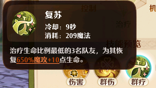 三技能“复苏”是一个群疗技能,冷却为9秒,通过消耗209点魔法即可让己方血量最少的三名队友获得650%魔攻 10的血量回复,该技能的消耗很大,不过作用的队友数量也很多,如果后期魔攻上去了,甚至能够直接让自己边的三个残血队友瞬间回复满状态。