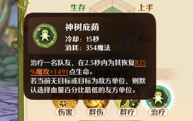 大招“神树庇荫”是最耗魔的一个技能,单次施放直接需要消耗掉354点魔法,并且它的冷却也有足足15秒,使用后可以为单体队友持续回血,2.5秒内共计可以恢复825%魔攻 1491的生命值,值得一提的是这个技能是可以指定目标使用的,所以加血的灵活程度也得以大大提升,另外如果没有指定目标,或是指定到了敌人目标也无需担心,它会默认为您阵中血量最少的友方单位回血。该技能的使用相比复苏会更加灵活一些,并且无论是回血量的魔攻加成,还是固定提供的回血数值,对比复苏也都要高了很多,唯一美中不足就是只能为一个目标回血。