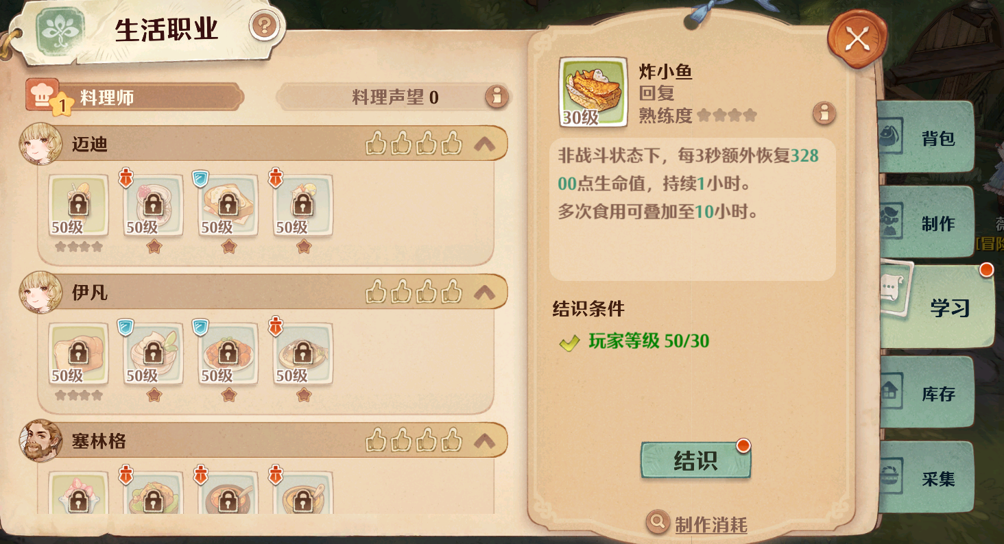首先料理师它需要你不断的去拜访各种NPC来获取新食谱,之后根据这些食谱来配制出优秀的菜品,将一项食谱的精通程度提升至满星之后即可获取部分经验。